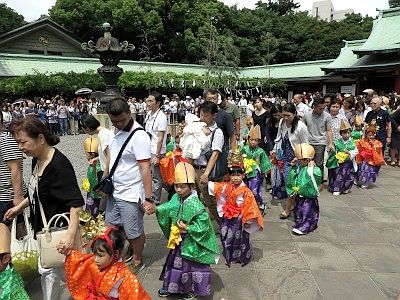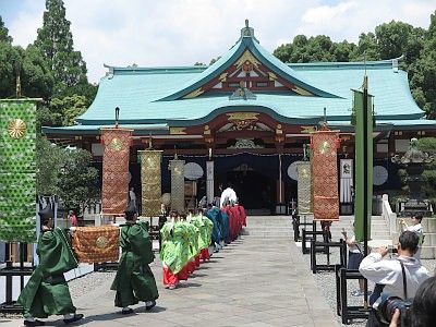 The Sanno Matsuri, which is held at Akasaka Hie Jinja in mid-June, is another name for the Reitaisai, or the Annual Grand Festival, of the shrine. This festival is one of the most renowned traditional festival in Tokyo, but fully conducted only in even-numbered years. In the Edo period, along with the Kanda Matsuri of Kanda Myojin held fully only in even-numbered years, the mikoshi procession of this festival was allowed to enter the Edo Castle (modern-day Imperial Palace) for the Shogun to see it, thus being held in turn.