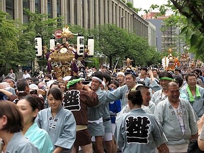The territory of the Hie Shrine can be divided into two areas - Kamimachi on the west side and Shitamachi on the east side. Large processions of community-owned mikoshi are held at Kamimachi on Saturday evening and at Shitamachi on Sunday noon.