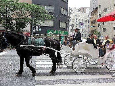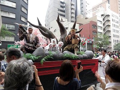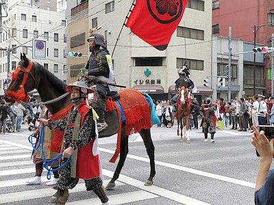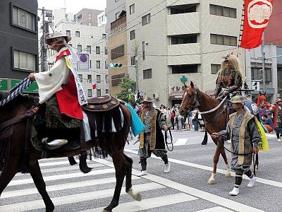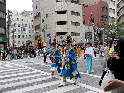 Click below blue icon and a window depicting the route and time of the shinko-sai for 2017 overlaid on GoogleMaps pops up. The red line is the main procession and the blue line is the procession of samurai warriors on horseback and baloon floats which joins the main procession partially. It's said that the best place to see this parade is at in front of the Nihombashi Mitsukoshi department store (around 4:30pm).