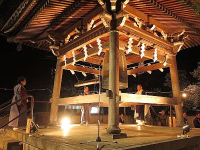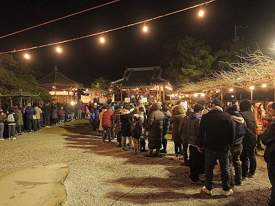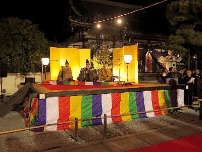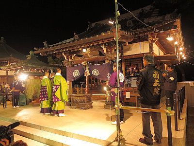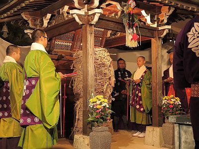 From 11pm on New Year's Eve, the temple monks do nawatoki (縄解き), or untying of the ropes binding Shibarare Jizo. From 0AM, firstly monks, and then ordinary people attending the ceremony, bind it again with new ropes (縄かけ). While this ceremony is going on, Gagaku music is performed.