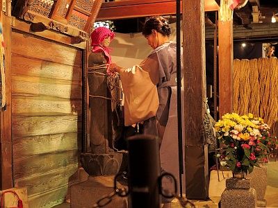 The head priest of the temple untie the ropes with help of assistants and uncover Shibarare Jizo, which is a stone statue erected in 1701.