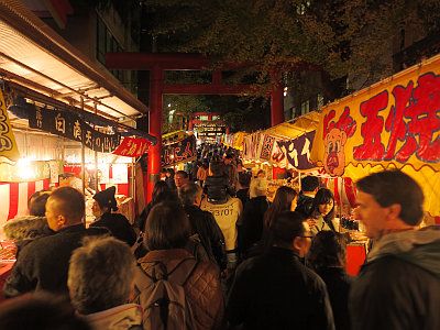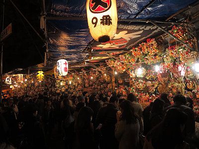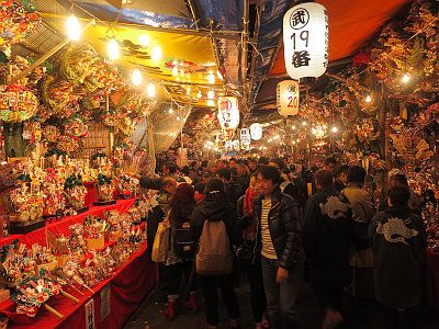 In November, dozens of Shinto shrines in Tokyo hold events called the Tori-no-ichi twice (or thrice, depending by the year.) At this event, decorated rakes are sold as talismans which gather fortune. Of The Tori-no-ichi held in Tokyo proper, the largest is the one held at Asakusa Otori Jinja Shrine, and this held at Hanazono Jinja Shrine is in the second place, but Asakusa Otori Jinja's may be way TOO crowded, so going to Hanazono Shrine instead might be a better option for a foreigner.