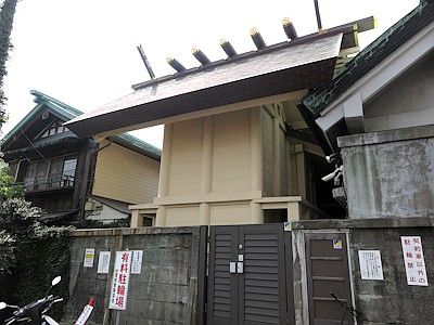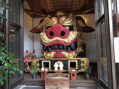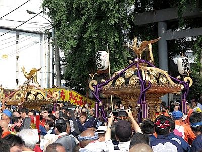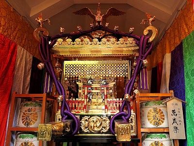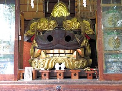 There are three mikoshi (portable shrines) owned by the shrine here, one ordinary type and two lion-head types (those two displayed in the precincts). In a fully implemented year, the ordinary type and one of the lion-head types parade through the territory the shrine guards. In other years, one of the three mikoshi parades through the territory.