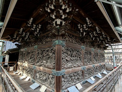 Naiden of Taishakudo was completed in 1915. The surfaces of its walls are covered with sculptures, and 400 yen is required to see these (and the Japanese stroll garden).