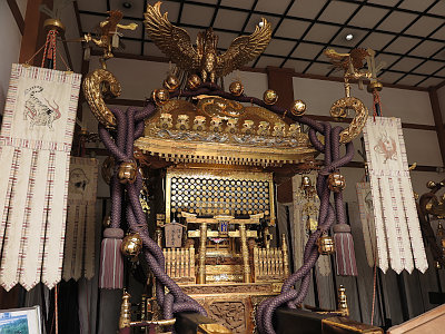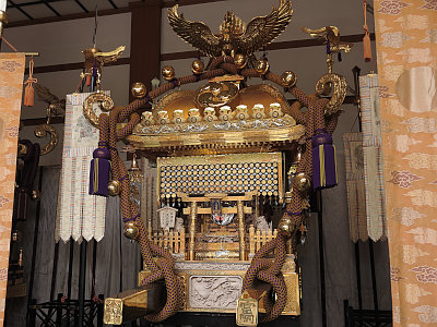 Two large mikoshi, or portable shrines, are displayed. Tomioka Hachimangu claims that one of them, the Honsha Ichinomiya Mikoshi, is the No.1 mikoshi in Japan, weighing 4.5 metric tons (9,920 pounds) and decorated with diamonds and rubies.