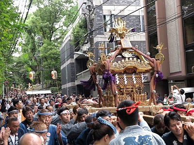 The Akasaka Hikawa Matsuri (赤坂氷川祭), the annual grand festival of this shrine, is held in mid-August. Every year, there're joint processions of dashi floats and some mikoshi (portable shrine) for consecutive three weekend days. For details about this event, see the article on the Akasaka Hikawa Matsuri at Akasaka Hikawa Shrine.