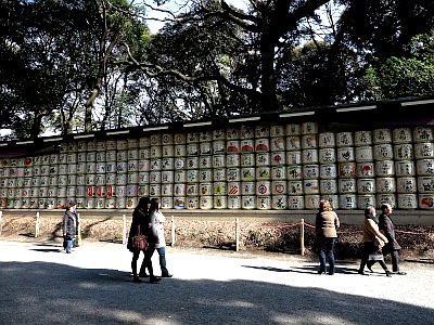 Hatsumoude is a countrywide custom of visiting Shinto shrines (and some major Buddhist temples) to offer prayers in the early days of a new year, first three days in particular. And of all the shrines and temples in Japan, Meiji Shrine attracts prayer-offerers the most - it's estimated that over three million people visit this shrine during the first three days of January. For details, see the article on hatsumode at Meiji Shrine.