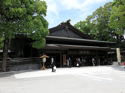 If you go into the courtyard from one of the gates surrounding the yard, at the northern end stands the Outer Haiden, the building where ordinary people offer prayers. The next building which you can see from there in the recess is the Inner Haiden, the place where priests offer prayers.