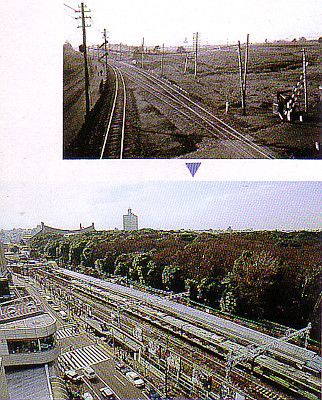This two photos show what happened to the land before and after the creation of Meiji Shrine. The railroad in the middle is the JR Yamanote Line. It is a view from the east side (Harajuku side), and looking toward south. This is a page from a book named "大都会につくられた森 明治神宮の森に学ぶ" published in 1992.