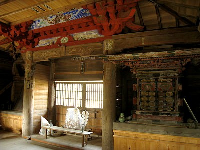 拝殿内の右側の厨子はかつての祭神だった弁財天の厨子か。中央の扉は本殿を遥拝するために遷座後に設けた。