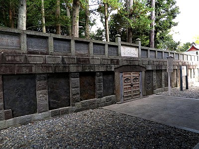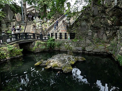 仁王門を潜ると仁王池があり、大本堂への石段左右の築山には石碑等が林立する。