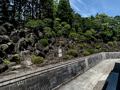 大本堂裏の長大な築山は明治12年築造。八大童子や三十六童子、役行者などの像が配置されている。