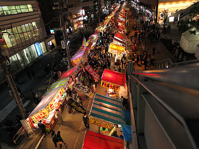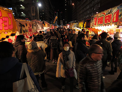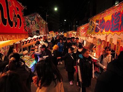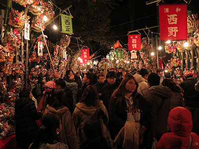 川口神社のおかめ市(大歳祭)は曜日に関わらず12月15日に日程が固定されて催される大規模な熊手市で、数百店の露店がJR川口駅近くから神社まで並ぶ。