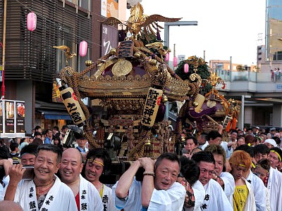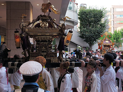 土曜日曜とも、日中は子供神輿と山車が、夕刻からは大人神輿2基(一之宮と二之宮)が、氏子7ヶ町を渡御する。