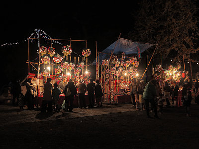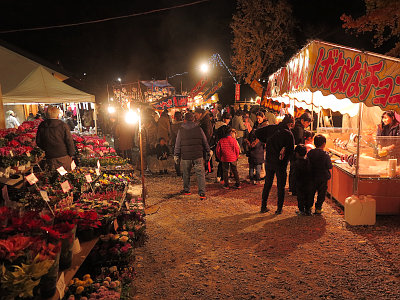 熊手を売る露店は数軒で、普通の露店も若干出る。富士塚は富士山型にイルミネートされる。