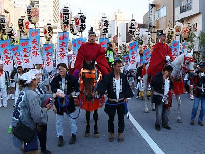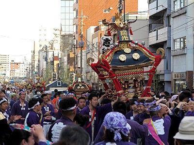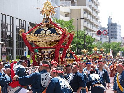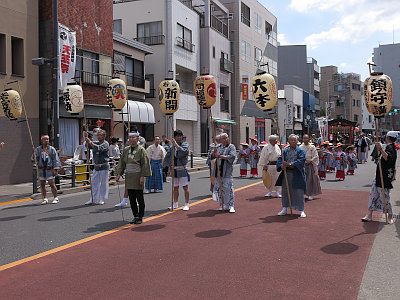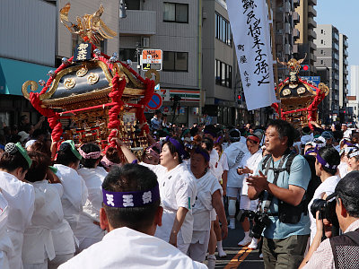 千住間道七ヶ町連合渡御は日曜の午前中に七ヶ町の町神輿が連合渡御する行事で、毎年行われる。