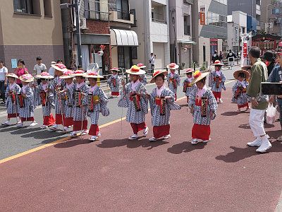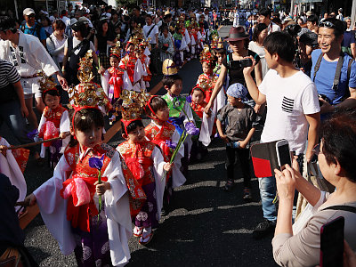 囃子屋台に続いて子供神輿の連合渡御。大人の手助けで神輿振りをしながら進む。