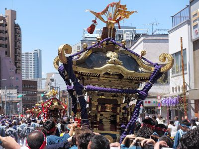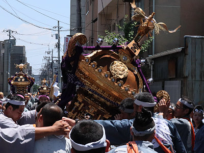 本社大神輿は鳳車に乗せられて渡御。この神輿は俗にいう千貫神輿で、明治10年製作(鳳車は大正14年製作)。