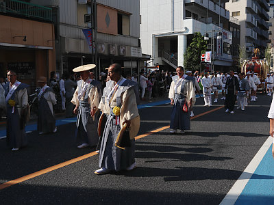 高張と役員らに太鼓が続き、その後に町神輿群が来る。