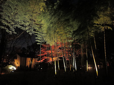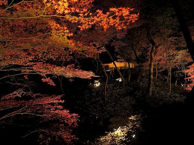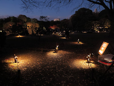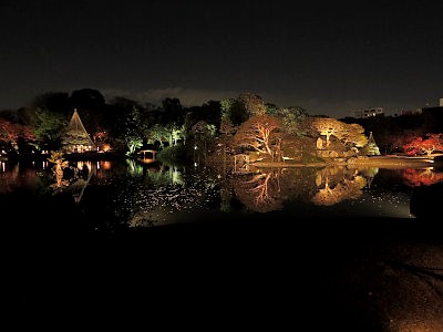 六義園では、紅葉の季節に当たる11月中旬~12月上旬において夜間開園が行われ、庭園がライトアップされる。