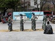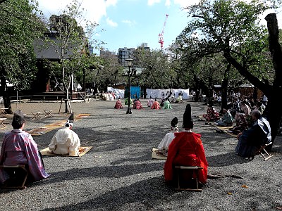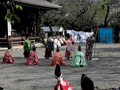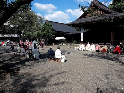 靖国神社では、秋季例大祭(10月17~19日)に一週間ほど先立つスポーツの日(旧体育の日、10月第2月曜日)に、能楽堂前において小笠原流の草鹿式という古式の弓術儀式が行われる。