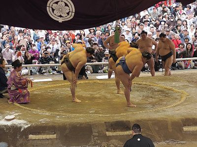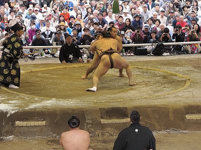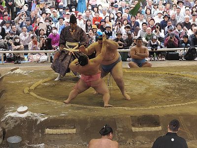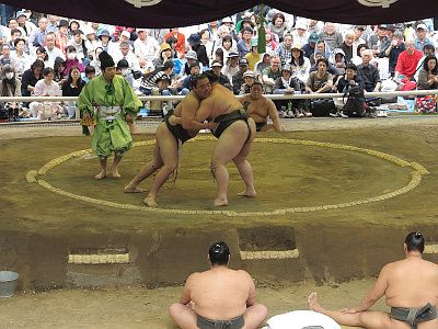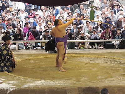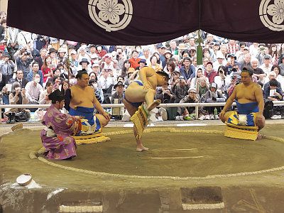 毎年4月中旬、靖国神社においては、大相撲力士による相撲が奉納される。