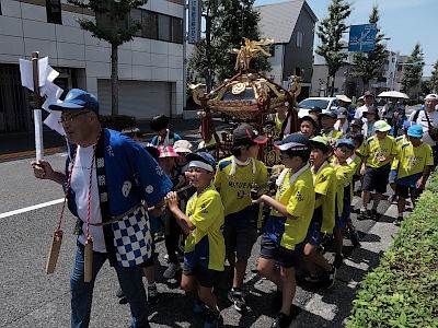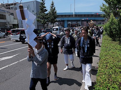 まず子供神輿が、次いで少し間を開けて宮神輿が渡御する。宮神輿の屋根は若干変則的。