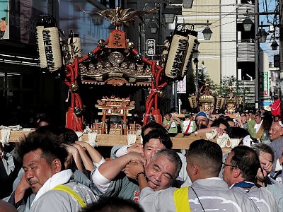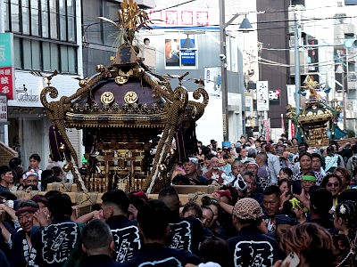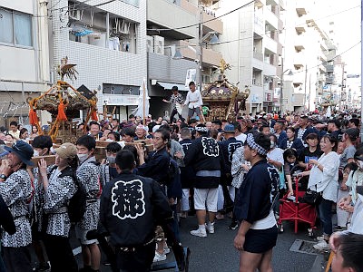 毎年、旧中山道沿いの3ヶ町の町神輿が、日曜に連合宮入する。