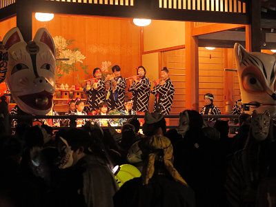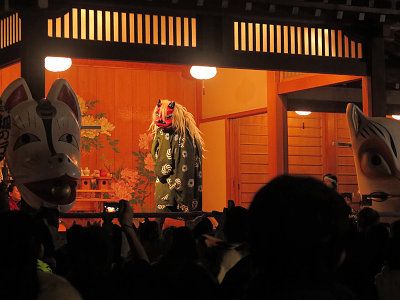 行列の一行が王子稲荷神社に到着すると、神楽殿では神事が行われ、その後、お囃子や獅子舞が奉納される。