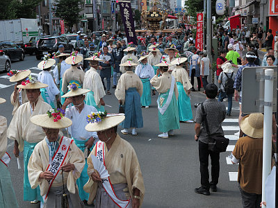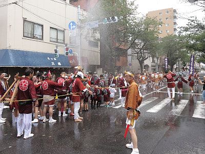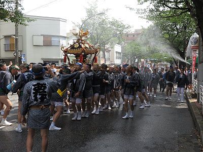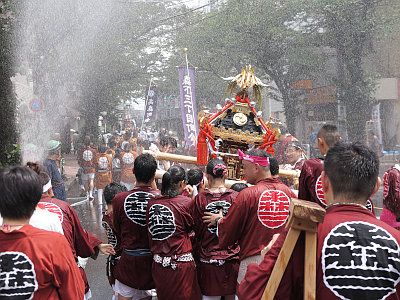 真夏の渡御であるため、神輿行列には豪快に水が掛けられる。いわゆる水掛け祭である。