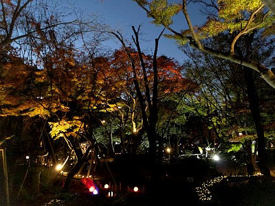 高橋是清翁記念公園では、紅葉の季節に夜間ライトアップが施される。