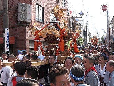 拝殿前の獅子舞が終わった頃、神社前から町神輿が連合宮出し。