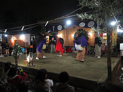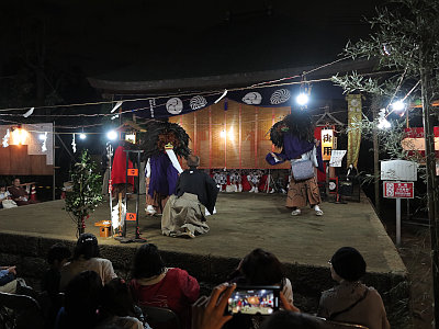 獅子舞の練り行列終了後は、休憩をはさみながら夜まで舞台で三匹獅子舞が舞われる。