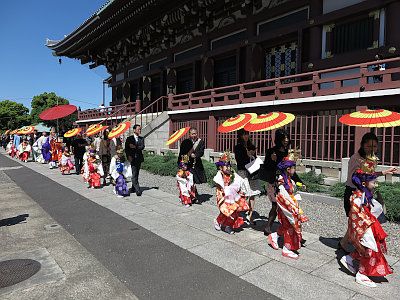 千部会とは、宗祖日蓮が現在の千葉県鴨川市の清澄山で、建長5年(1253年)4月28日、初めてお題目を唱え立教開宗したことにちなみ、池上本門寺で4月27~29日に行われる一連の法要で、法華経一部を読誦するもの。うち第三日目には世界平和祈願天童音楽大法要が行われ、それに伴い稚児行列が出る。