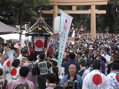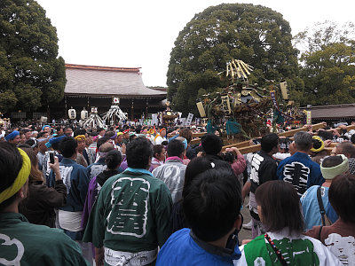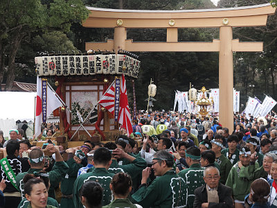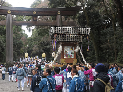 マーチングバンドが表参道を通過したのち、表参道沿いに控えていた神輿や山車が連合渡御を行う。明治神宮は氏子地域を持つ鎮守社ではなく氏子はいない(いわゆる講に相当する崇敬者団体はある)ため、神輿は地元ではなく各地から集まったものである。