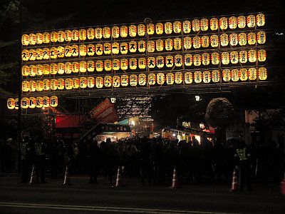境内には多数の露店が出店し、社殿の周りには多数の提灯が掲げられる。