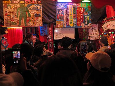 表参道から入ってすぐ左手には名物の見世物小屋がある。かつては日本に多数いた見世物小屋業者も現在では1軒のみと言われるが、花園神社の酉の市はその見世物小屋が立つ祭礼の一つである。