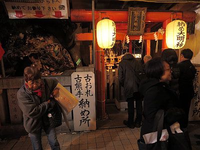 財をかき集めるとされる縁起物の飾り熊手の露店も多数立つ。バリエーションも色々あり、興味深い。