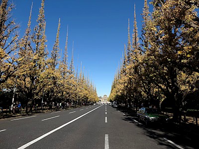 外苑の南端にあるイチョウ並木146本は、大正15年の外苑竣工当初からのもの。