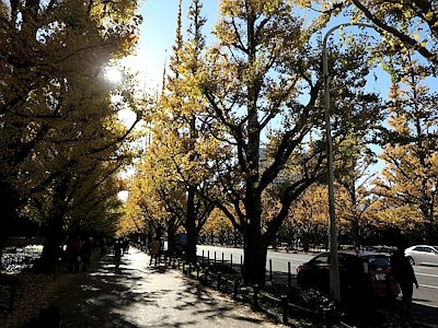 神宮外苑のイチョウ並木は、東京メトロ銀座線外苑前駅より東へ徒歩3分、または東京メトロ銀座線・半蔵門線および都営大江戸線の青山一丁目駅より西へ徒歩3分の地に位置する。