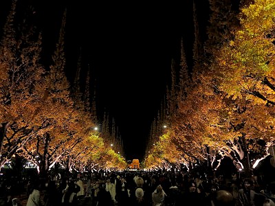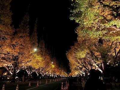 この並木が色づく11月下旬~12月初旬頃には、夜間ライトアップが行われる。