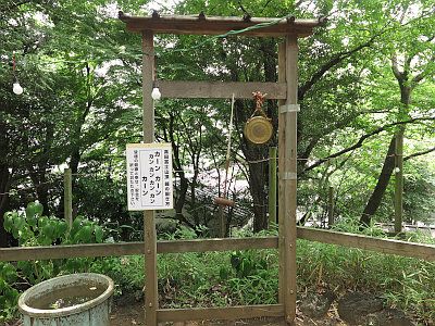 富士塚の頂上には鉦もあり、登拝者は叩くことができる。