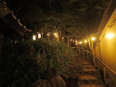 夜には提灯や登山道沿いの電球が灯され、頂上では噴火口に擬して火が焚かれる。