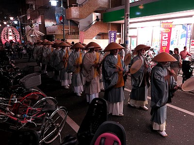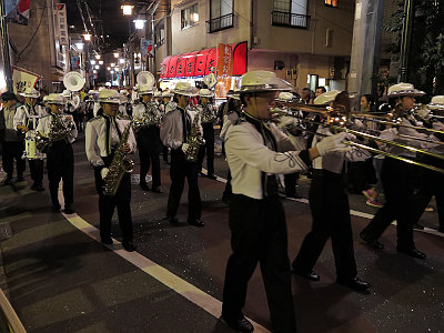 万灯練り供養に先立ち、まず東京立正中・高校のブラスバンドがパレードを行う。