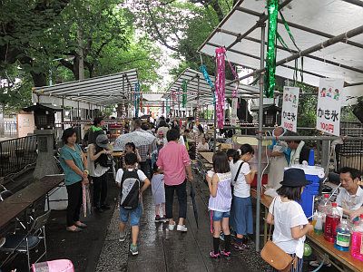 当社ではこの前日である6月30日の夏越大祓で拝殿前に茅の輪が設けられ、この二日間渡って朝顔市と縁日の模擬店が出る。