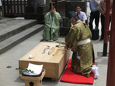 楽が奏されるなか、四條流包丁式で鰻がさばかれる。四條流包丁式についての詳細は「神田明神 だいこく祭」の記事を参照。この後、幼稚園児らによる鰻のつかみ取りも行われた。