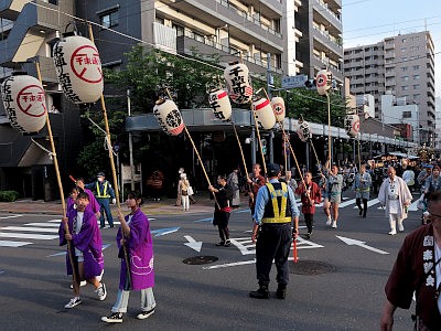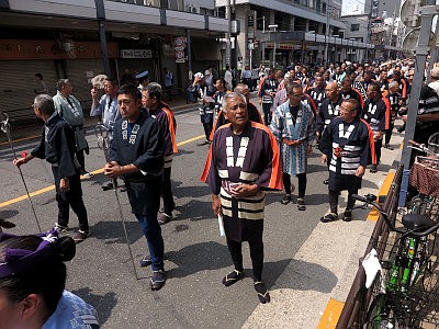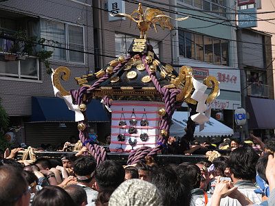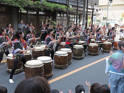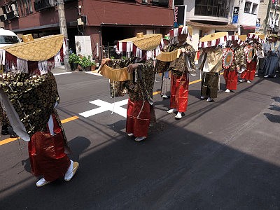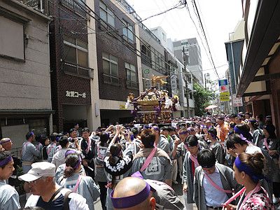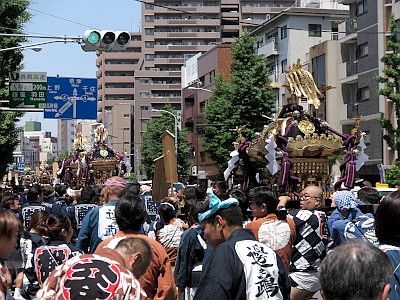 言問通り(浅草神社北方の大通り)北側の、千束通り周辺の四ヶ町の連合渡御。千束通り商店街を中心に連合渡御する。