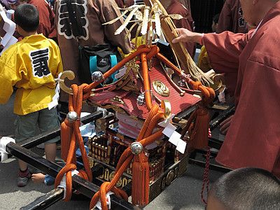 町神輿は擬宝珠の神輿が目立つほかは、オーソドクスな形状が大半。少し変わったものは、この浅草千和町会の入母屋造の小神輿ぐらいであった(この町会には小神輿が2基ある)。