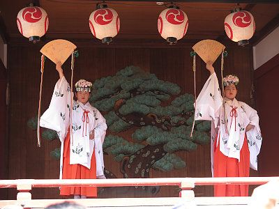 大行列後、まず社殿で、次に神楽殿で、東京都指定無形民俗文化財であるびんざさら舞が奉納される。