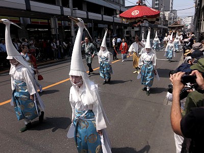 びんざさら舞や芸妓、白鷺の舞などで構成された大行列が、東京浅草組合を発して浅草神社に到る。